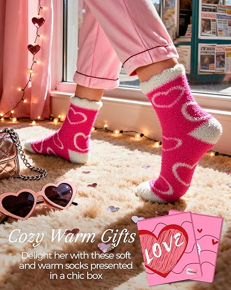 - Step into Heartfelt Warmth: 5 pairs of ultra‑soft fuzzy pink socks with adorable heart patterns; perfect Valentine’s Day gifts. Tuck them into her Valentine basket as sweet surprises she’ll love. Cozy, cute, and full of heart